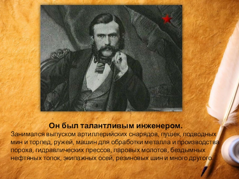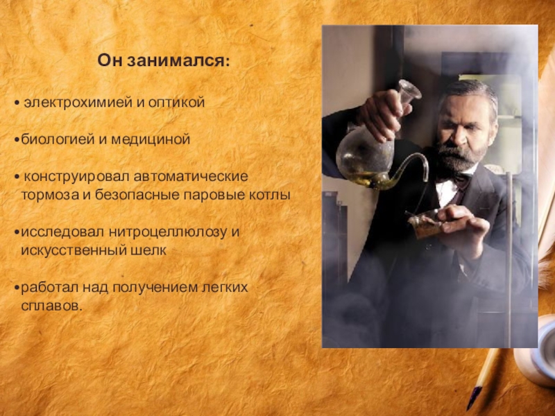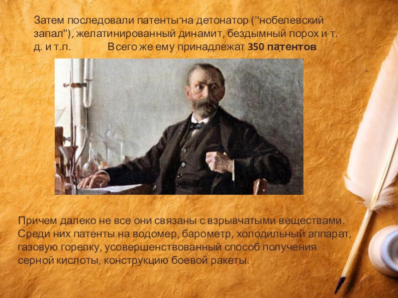 Причем далеко не все они связаны с взрывчатыми веществами. Среди них патенты на водомер, барометр, холодильный аппарат, газовую горелку, усовершенствованный способ получения серной кислоты, конструкцию боевой ракеты.