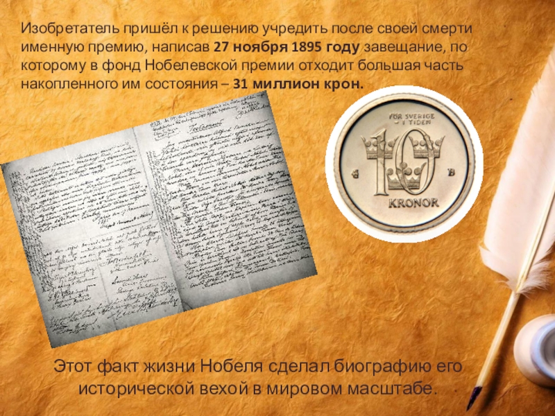 Этот факт жизни Нобеля сделал биографию его исторической вехой в мировом масштабе.