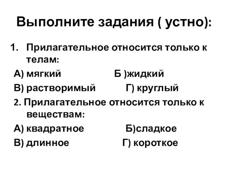 Выполните задания ( устно):Прилагательное относится только к телам:А) мягкий
