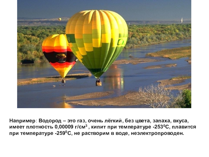 Слайд 12Например: Водород – это газ, очень лёгкий, без цвета, запаха, вкуса,