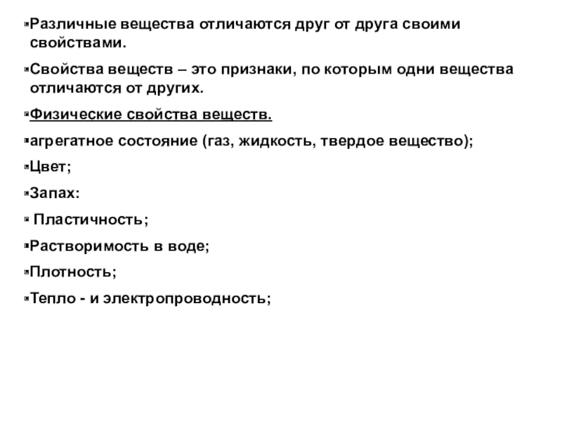 Различные вещества отличаются друг от друга своими свойствами. Свойства веществ – это признаки, по которым одни вещества