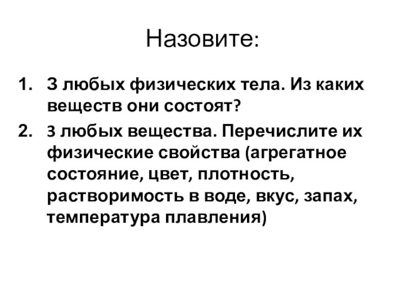Назовите:З любых физических тела. Из каких веществ они состоят?3 любых вещества. Перечислите их физические свойства (агрегатное состояние,
