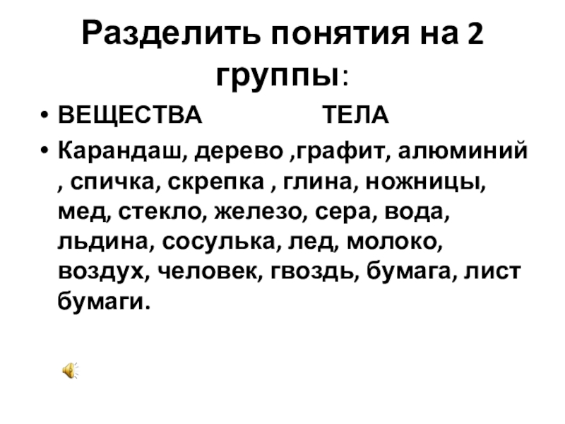 Разделить понятия на 2 группы:ВЕЩЕСТВА           ТЕЛАКарандаш, дерево
