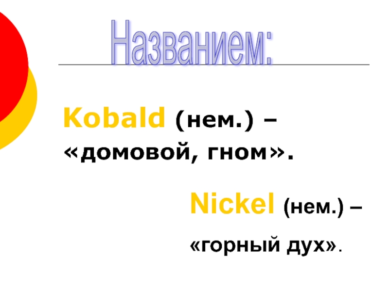Kobald (нем.) – «домовой, гном».Названием:Nickel (нем.) – «горный дух».