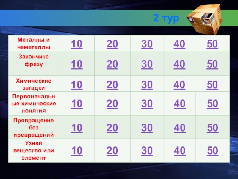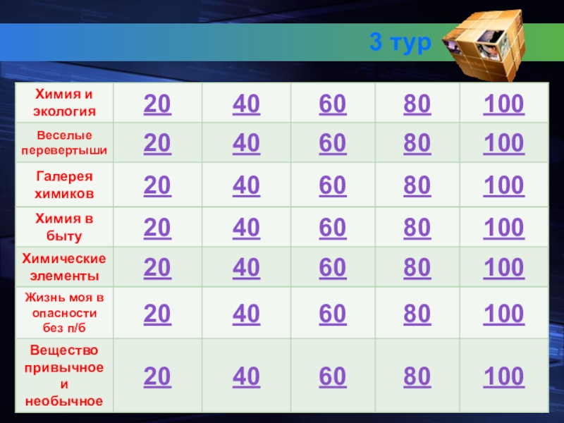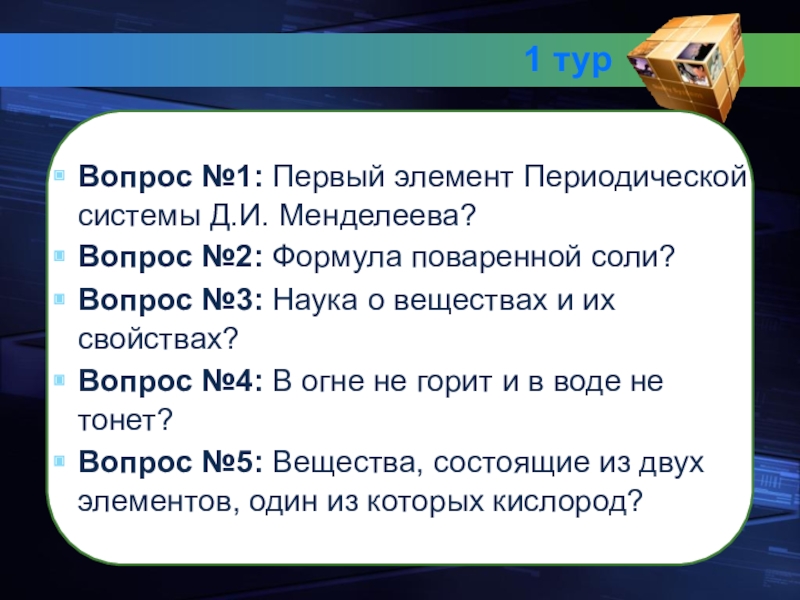 1 турВопрос №1: Первый элемент Периодической системы Д.И. Менделеева?Вопрос №2: Формула поваренной соли?Вопрос №3: Наука о веществах
