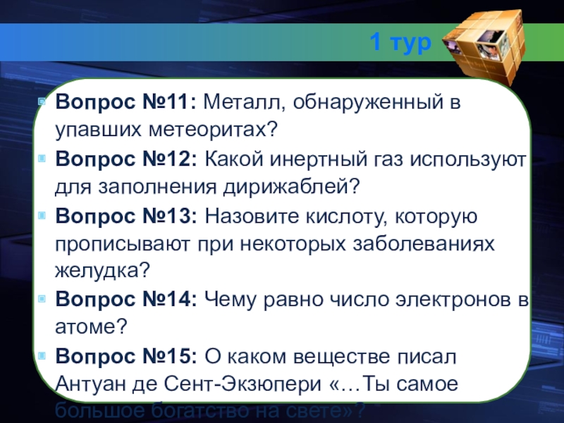 1 турВопрос №11: Металл, обнаруженный в упавших метеоритах?Вопрос №12: Какой инертный газ используют для заполнения дирижаблей?Вопрос №13: