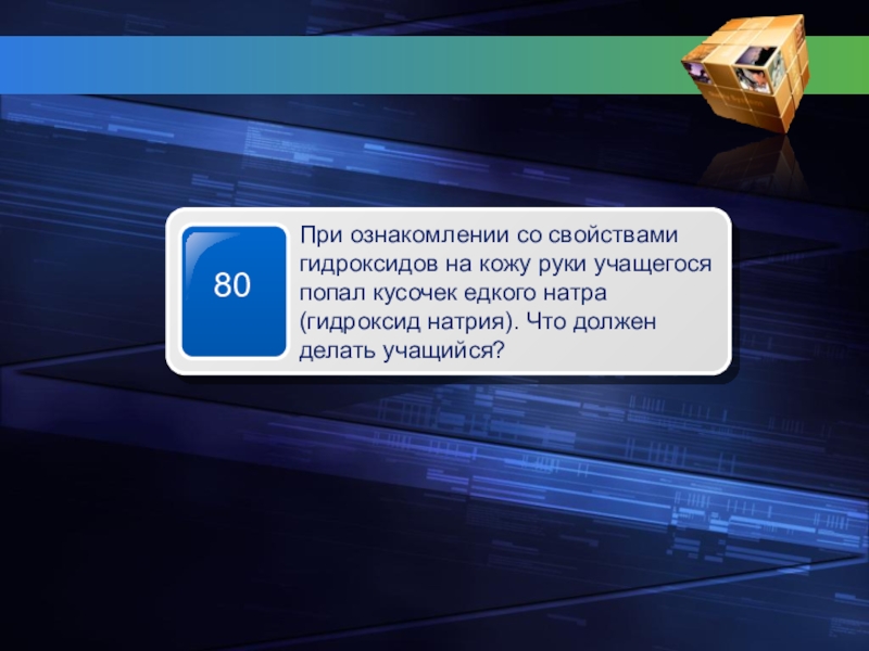 Слайд 69При ознакомлении со свойствами гидроксидов на кожу руки учащегося попал кусочек