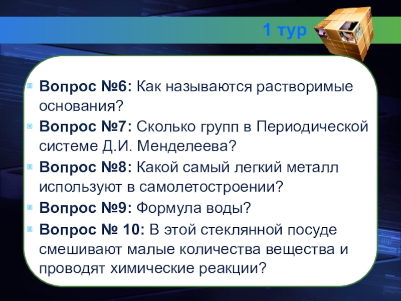 1 турВопрос №6: Как называются растворимые основания?Вопрос №7: Сколько групп в Периодической системе Д.И. Менделеева?Вопрос №8: Какой
