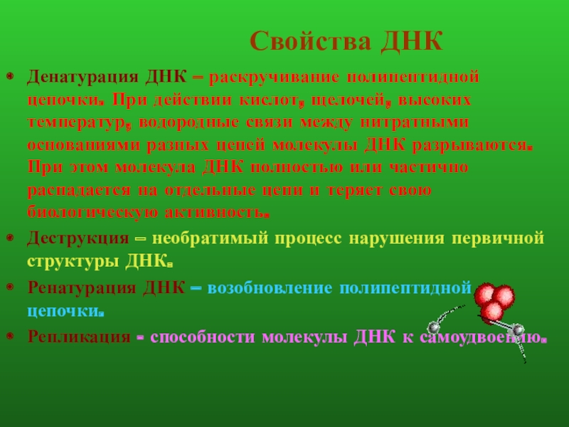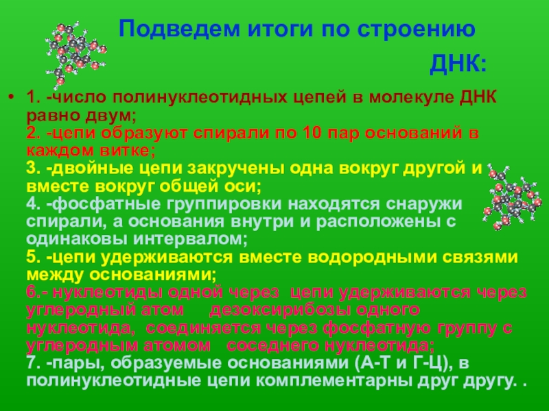 1. -число полинуклеотидных цепей в молекуле ДНК равно двум;