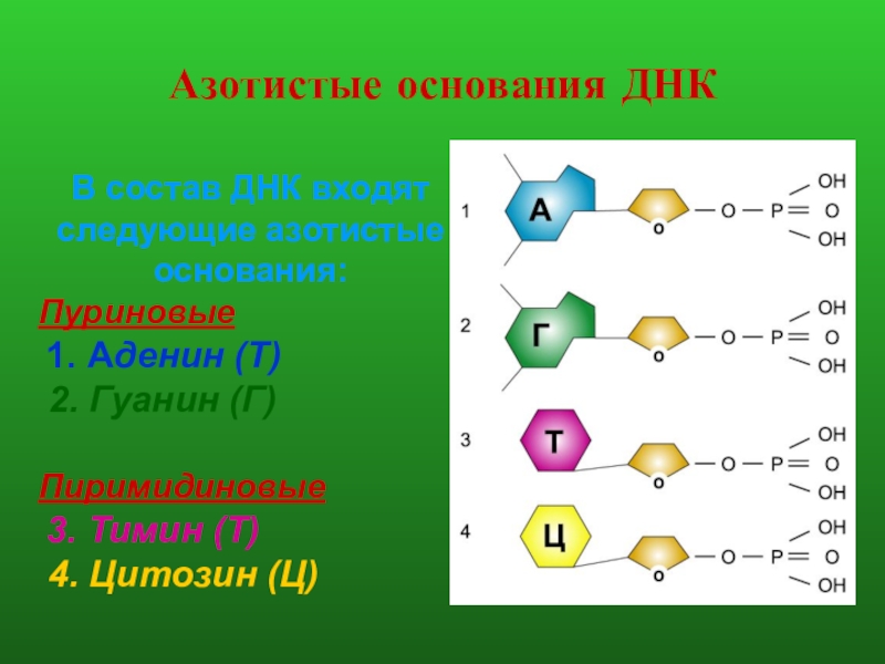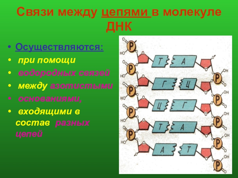 5. -цепи удерживаются вместе водородными связями между основаниями; 6.- нуклеотиды одной через цепи удерживаются через углеродный атом дезоксирибозы одного нуклеотида, соединяется через фосфатную группу с углеродным атомом соседнего нуклеотида;