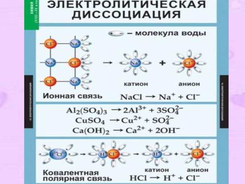 Все растворимые кислоты, основания (щёлочи) и соли