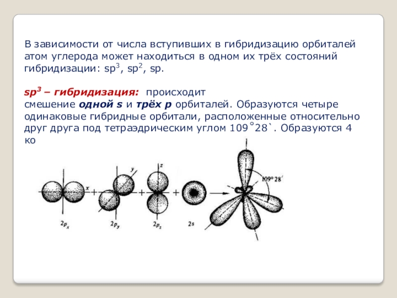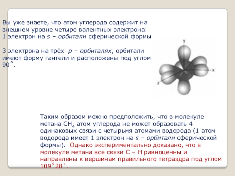 Таким образом можно предположить, что в молекуле метана CH4 атом углерода не может образовать 4 одинаковых связи с четырьмя атомами водорода (1 атом водорода имеет 1 электрон на s – орбитали сферической формы). Однако экспериментально доказано, что в молекуле метана все связи С – Н равноценны и направлены к вершинам правильного тетраэдра под углом 109˚28`.