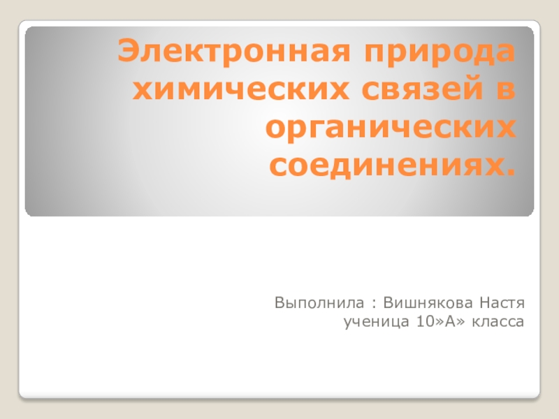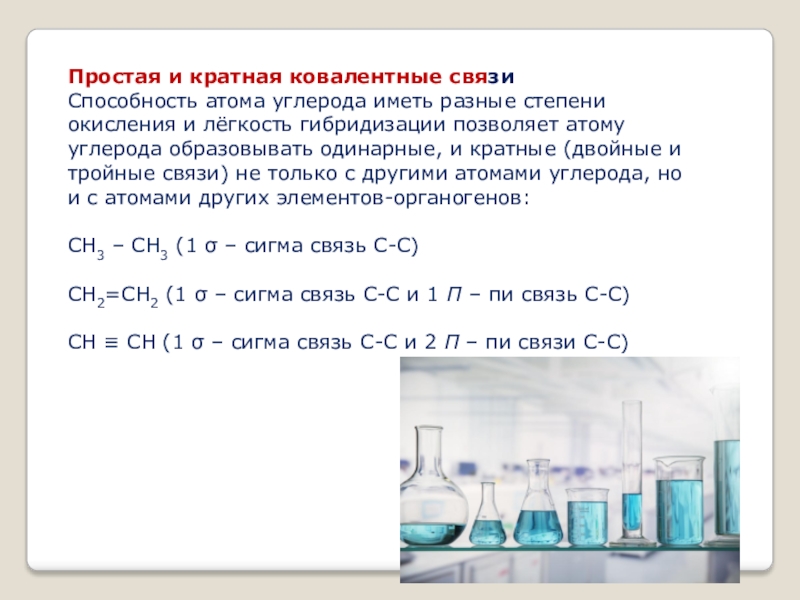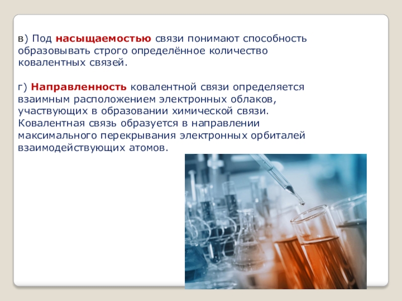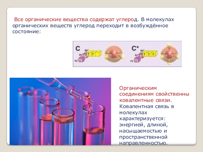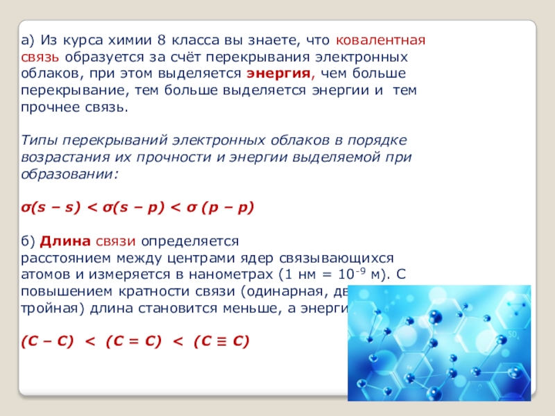 Органическим соединениям свойственны ковалентные связи. Ковалентная связь в молекулах характеризуется: энергией, длиной, насыщаемостью и пространственной направленностью.