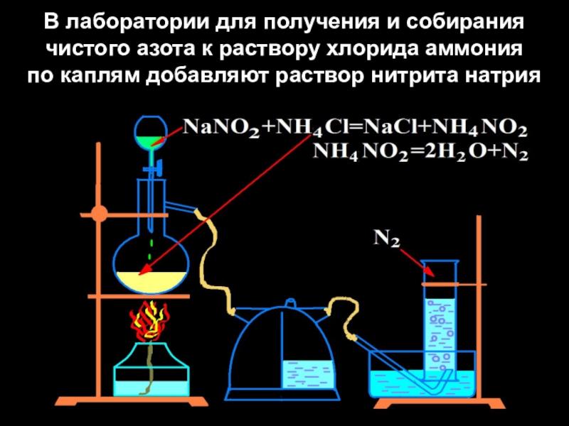 Слайд 5В лаборатории для получения и собирания чистого азота к раствору хлорида
