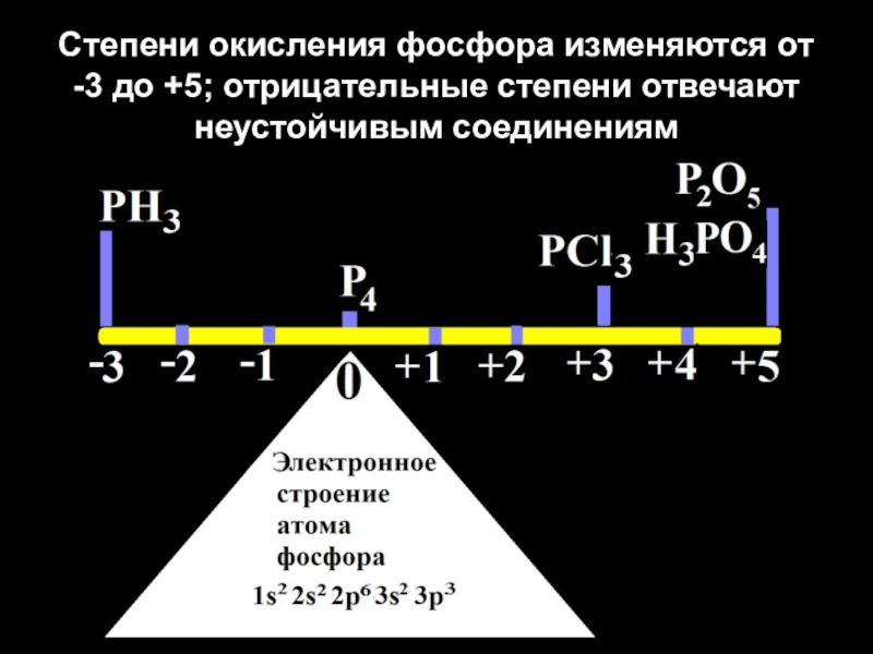 Степени окисления фосфора изменяются от -3 до +5; отрицательные степени отвечают неустойчивым соединениям