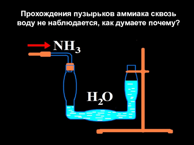 Слайд 11Прохождения пузырьков аммиака сквозь воду не наблюдается, как думаете почему?