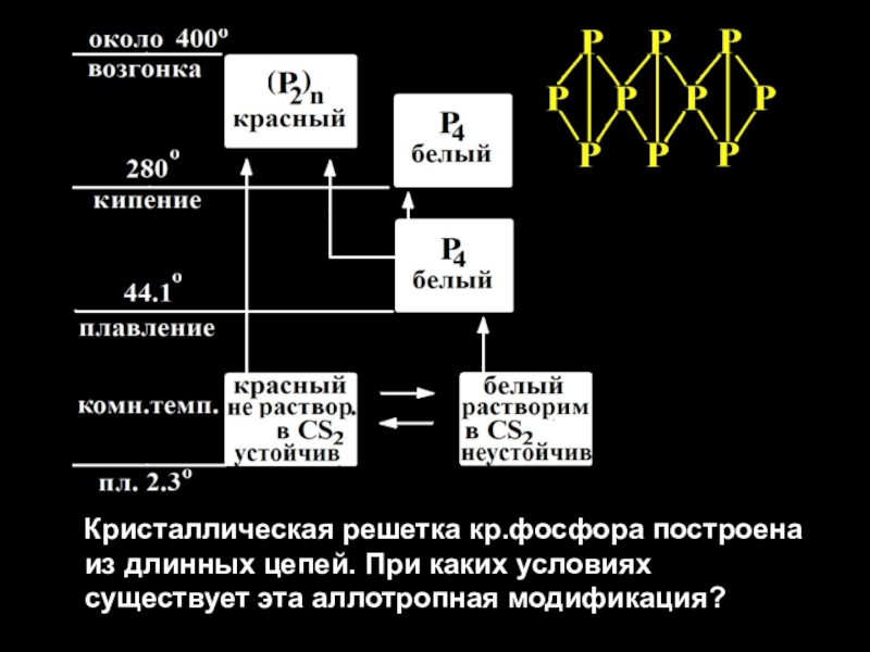 Кристаллическая решетка кр.фосфора построена из длинных цепей. При каких