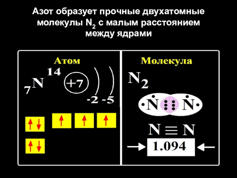 Слайд 6Азот образует прочные двухатомные молекулы N2 с малым расстоянием между ядрами