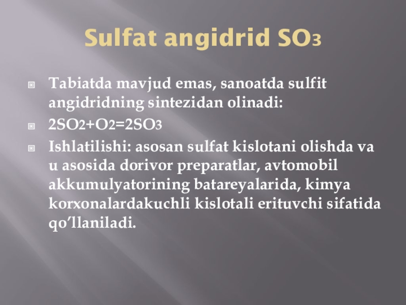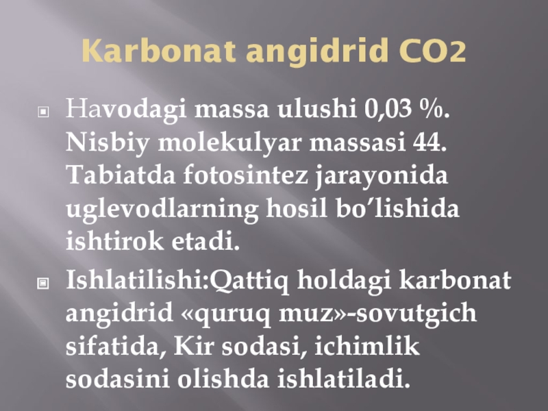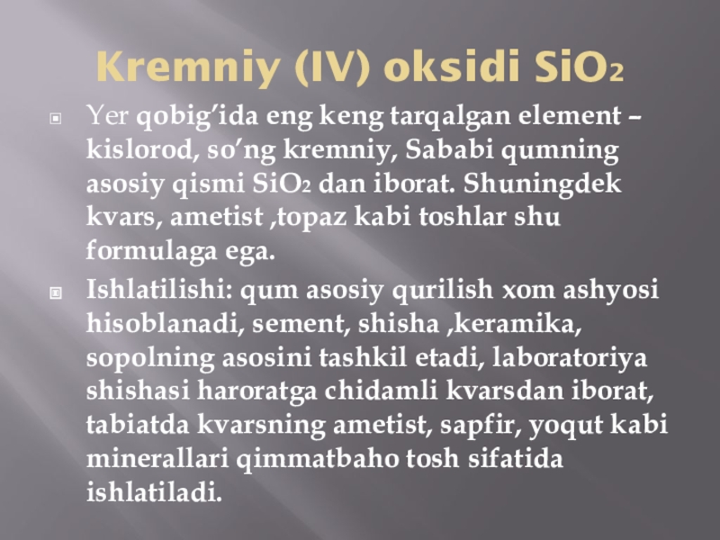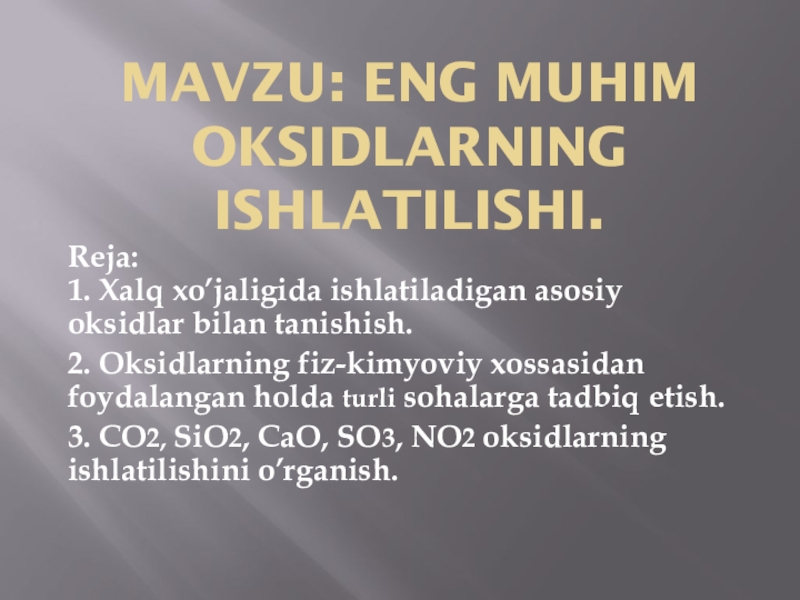 3. CO2, SiO2, CaO, SO3, NO2 oksidlarning ishlatilishini o’rganish.