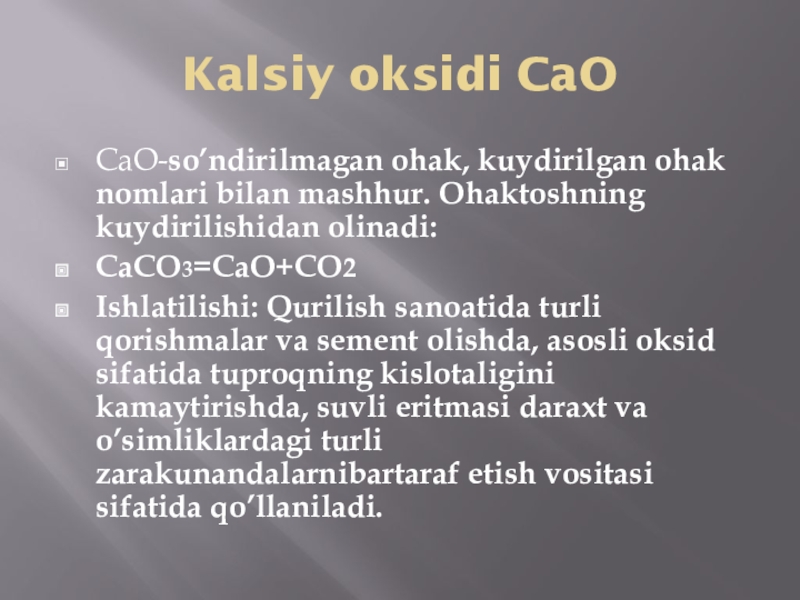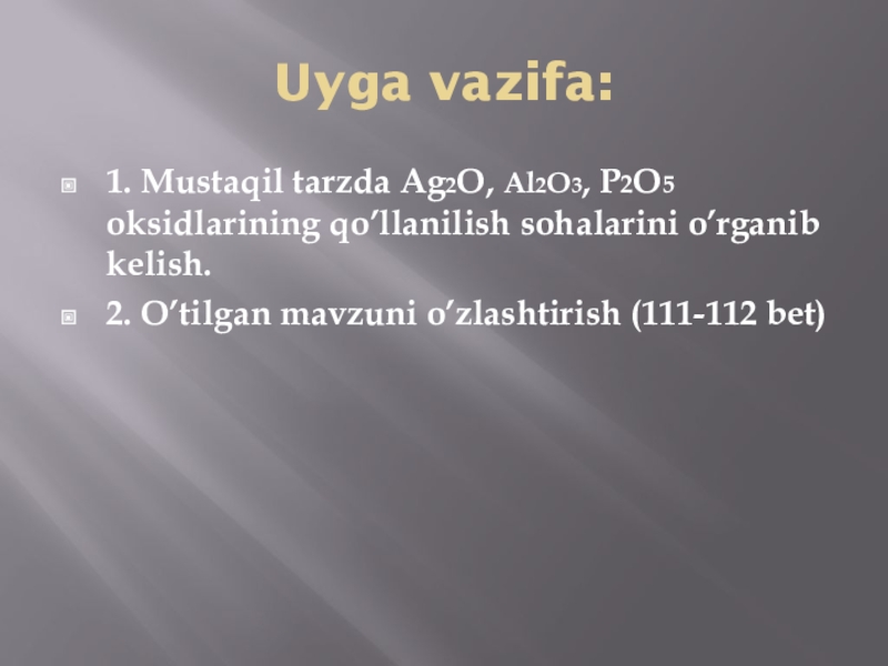 2. Oksidlarning fiz-kimyoviy xossasidan foydalangan holda turli sohalarga tadbiq etish.