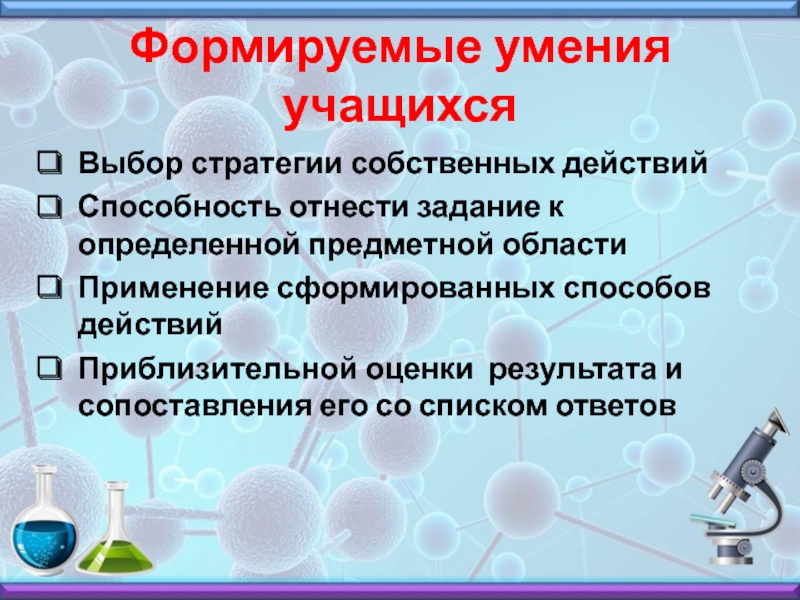 Формируемые умения учащихсяВыбор стратегии собственных действийСпособность отнести задание к определенной предметной областиПрименение сформированных способов действийПриблизительной оценки результата