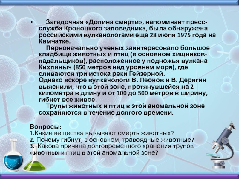 Вопросы: 1.Какие вещества вызывают смерть животных? 2. Почему гибнут, в основном, травоядные животные? 3. Какова причина долговременного хранения трупов животных и птиц в этой аномальной зоне?