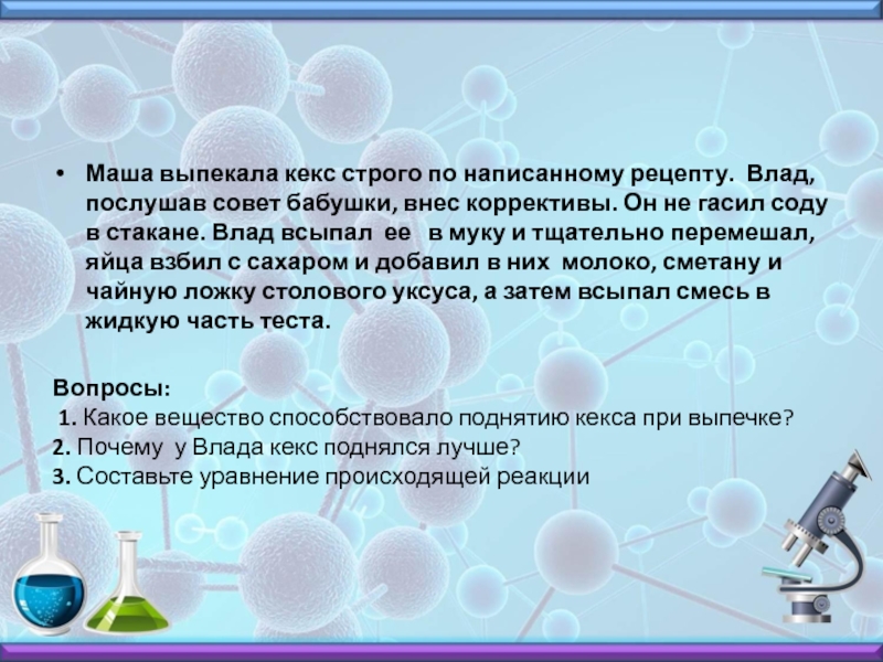 Вопросы: 1. Какое вещество способствовало поднятию кекса при выпечке? 2. Почему у Влада кекс поднялся лучше? 3. Составьте уравнение происходящей реакции