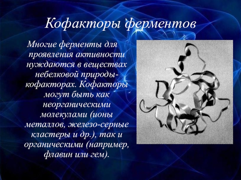 кофакторах. Кофакторы могут быть как неорганическими молекулами (ионы металлов, железо-серные кластеры и др.), так и органическими (например, флавин или гем).
