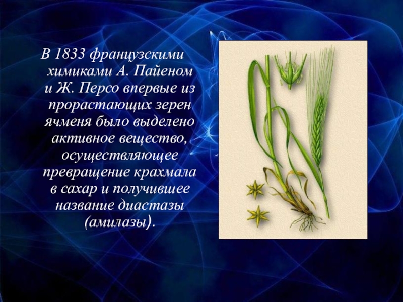 прорастающих зерен ячменя было выделено активное вещество, осуществляющее превращение крахмала в сахар и получившее название диастазы(амилазы).