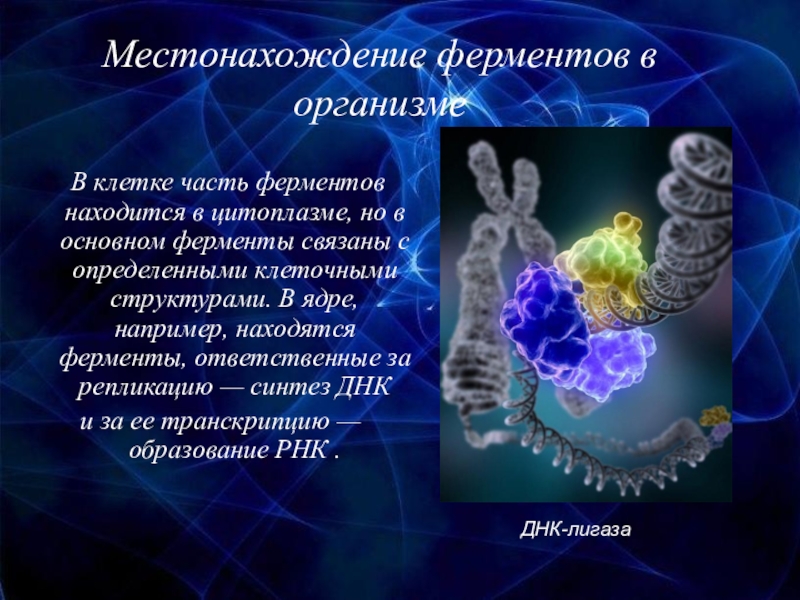 но в основном ферменты связаны с определенными клеточными структурами. В ядре, например, находятся ферменты, ответственные за репликацию — синтез ДНК