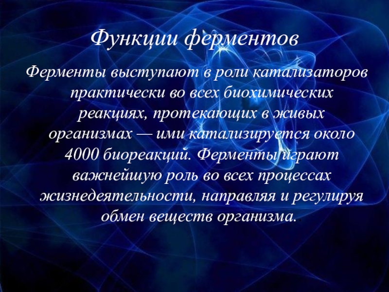 протекающих в живых организмах — ими катализируется около 4000 биореакций. Ферменты играют важнейшую роль во всех процессах жизнедеятельности, направляя и регулируя обмен веществ организма..