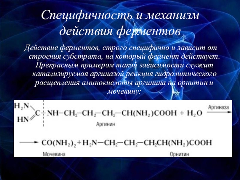 от строения субстрата, на который фермент действует. Прекрасным примером такой зависимости служит катализируемая аргиназой реакция гидролитического расщепления аминокислоты аргинина на орнитин и мочевину: