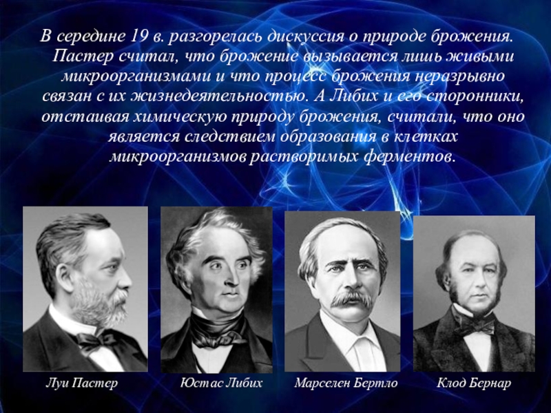 считал, что брожение вызывается лишь живыми микроорганизмами и что процесс брожения неразрывно связан с их жизнедеятельностью. А Либих и его сторонники, отстаивая химическую природу брожения, считали, что оно является следствием образования в клетках микроорганизмов растворимых ферментов.