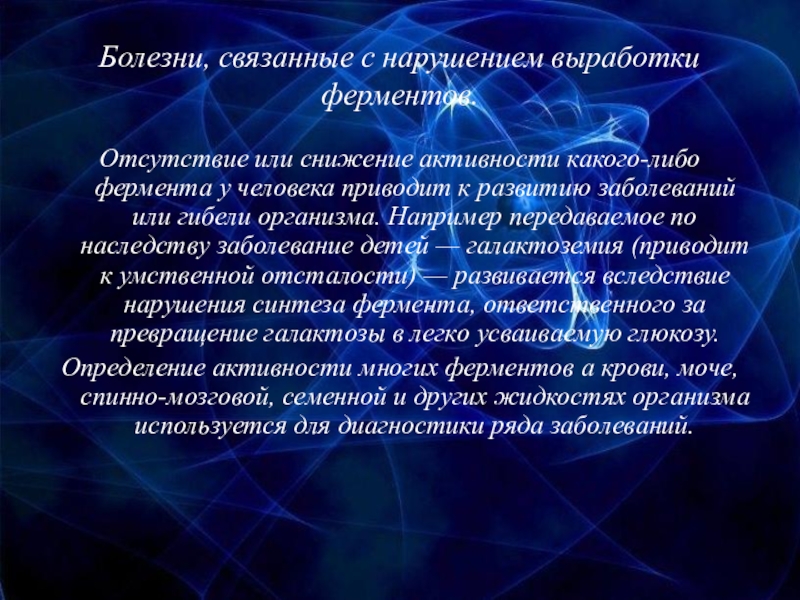 у человека приводит к развитию заболеваний или гибели организма. Например передаваемое по наследству заболевание детей — галактоземия (приводит к умственной отсталости) — развивается вследствие нарушения синтеза фермента, ответственного за превращение галактозы в легко усваиваемую глюкозу.