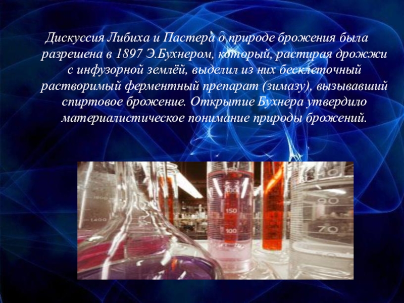 Слайд 6Дискуссия Либиха и Пастера о природе брожения была разрешена в 1897