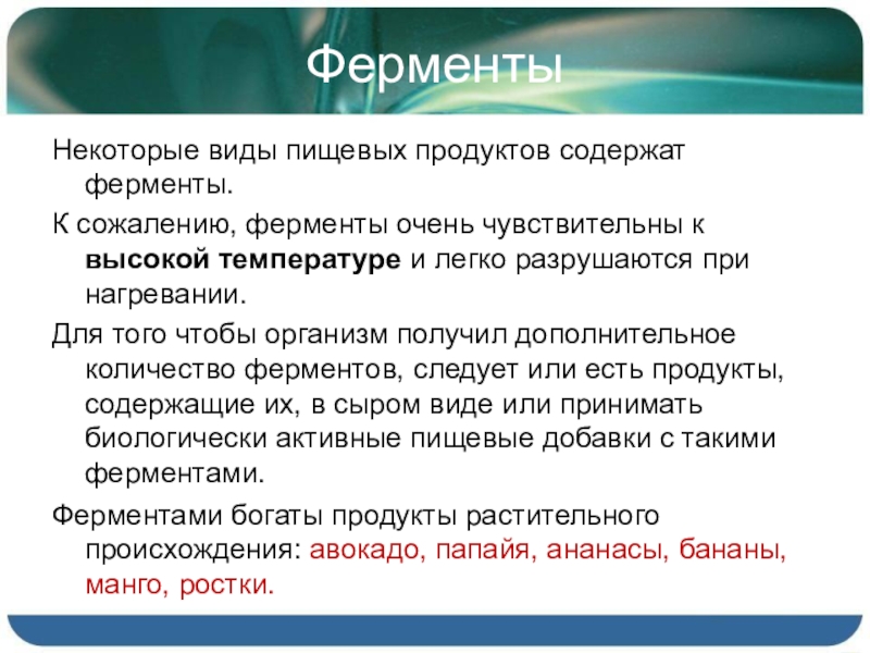 Ферментами богаты продукты растительного происхождения: авокадо, папайя, ананасы, бананы, манго, ростки.