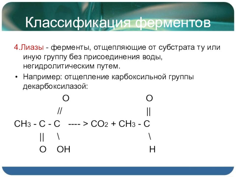 4.Лиазы - ферменты, отщепляющие от субстрата ту или иную группу