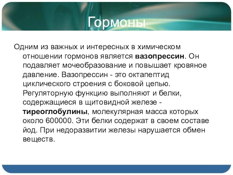 Он подавляет мочеобразование и повышает кровяное давление. Вазопрессин - это октапептид циклического строения с боковой цепью. Регуляторную функцию выполняют и белки, содержащиеся в щитовидной железе - тиреоглобулины, молекулярная масса которых около 600000. Эти белки содержат в своем составе йод. При недоразвитии железы нарушается обмен веществ.