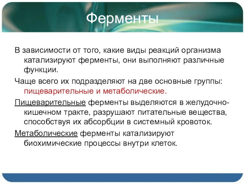 В зависимости от того, какие виды реакций организма катализируют ферменты, они