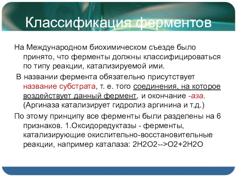 По этому принципу все ферменты были разделены на 6 признаков. 1.Оксидоредуктазы - ферменты, катализирующие окислительно-восстановительные реакции, например каталаза: 2H2O2-->O2+2H2O