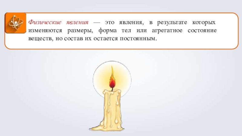 Физические явления — это явления, в результате которых изменяются размеры, форма тел или агрегатное состояние веществ, но состав их остается постоянным.