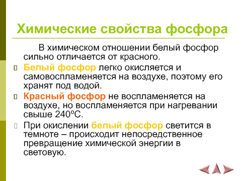 При окислении белый фосфор светится в темноте – происходит непосредственное превращение химической энергии в световую.