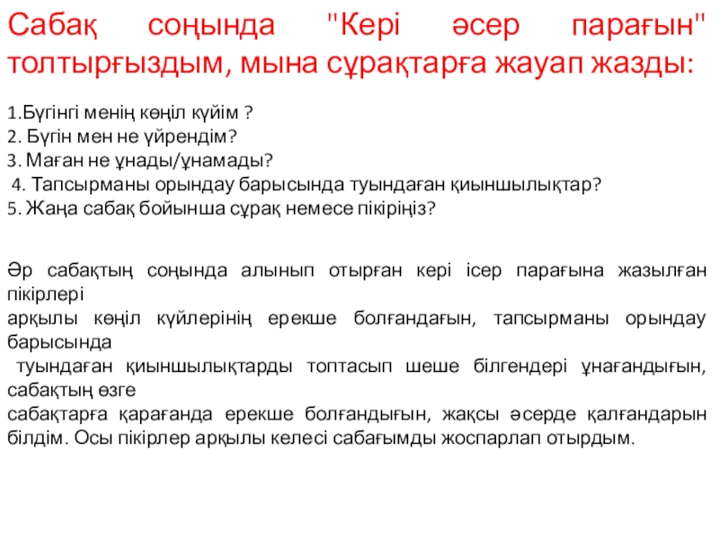 Слайд 71Сабақ соңында "Кері әсер парағын" толтырғыздым, мына сұрақтарға жауап жазды: