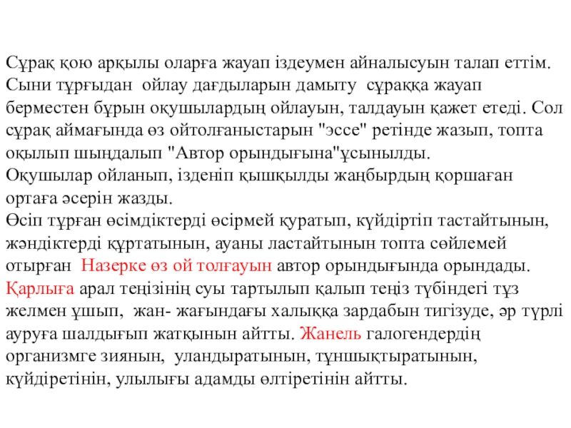 Слайд 64Сұрақ қою арқылы оларға жауап іздеумен айналысуын талап еттім.