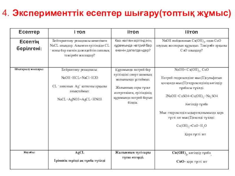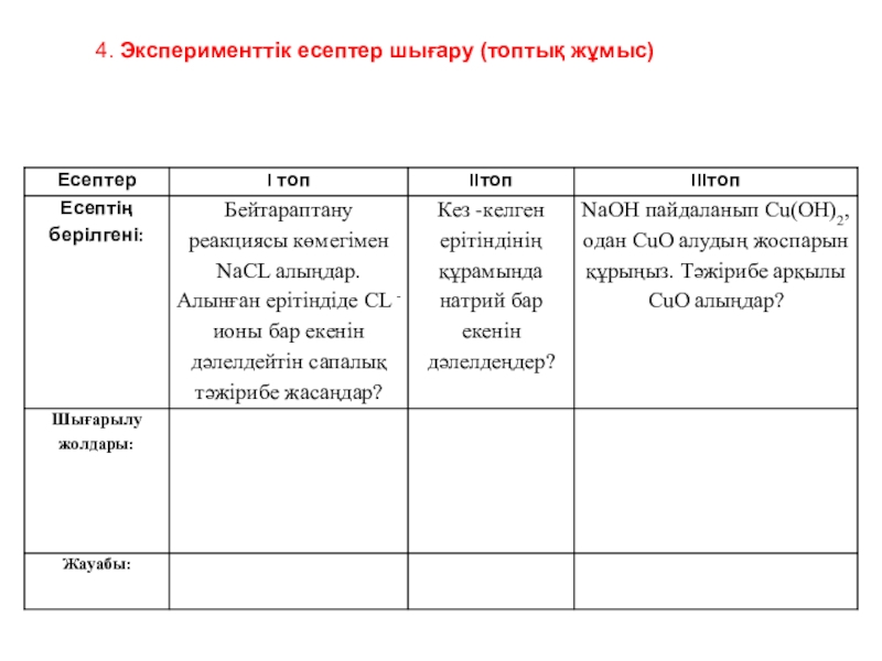 Слайд 174. Эксперименттік есептер шығару(топтық жұмыс)