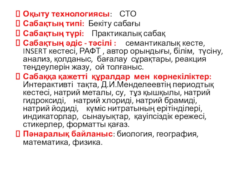 әдіс - тәсілі : семантикалық кесте, INSERT кестесі, РАФТ , автор орындығы, білім, түсіну, анализ, қолданыс, бағалау сұрақтары, реакция теңдеулерін жазу, ой толғаныс.