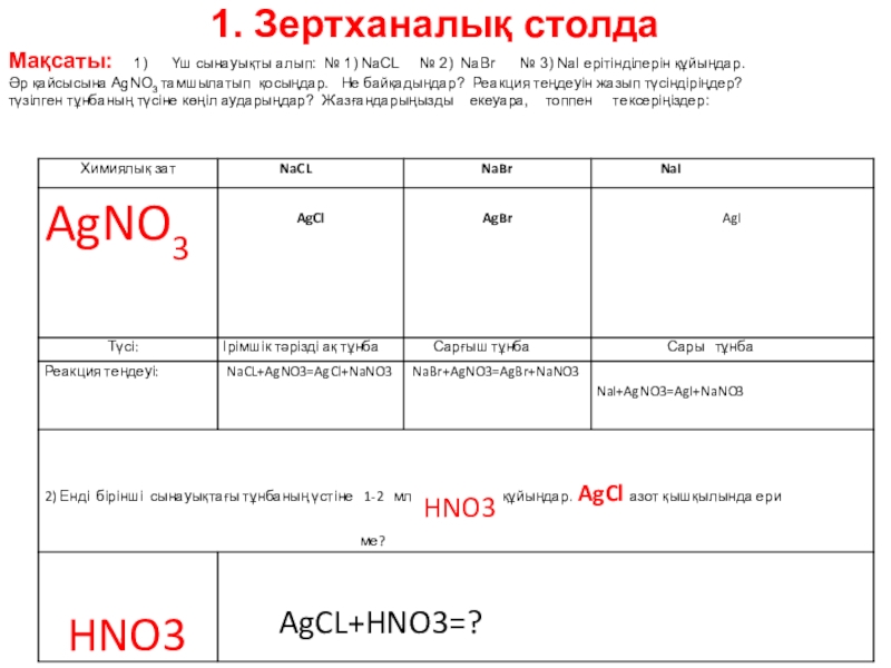 алып: № 1) NaCL № 2) NaBr № 3) NaI ерітінділерін құйыңдар. Әр қайсысына AgNO3 тамшылатып қосыңдар. Не байқадыңдар? Реакция теңдеуін жазып түсіндіріңдер? Түзілген тұнбаның түсіне көңіл аударыңдар? Жазғандарыңызды екеуара, топпен тексеріңіздер: