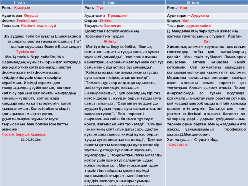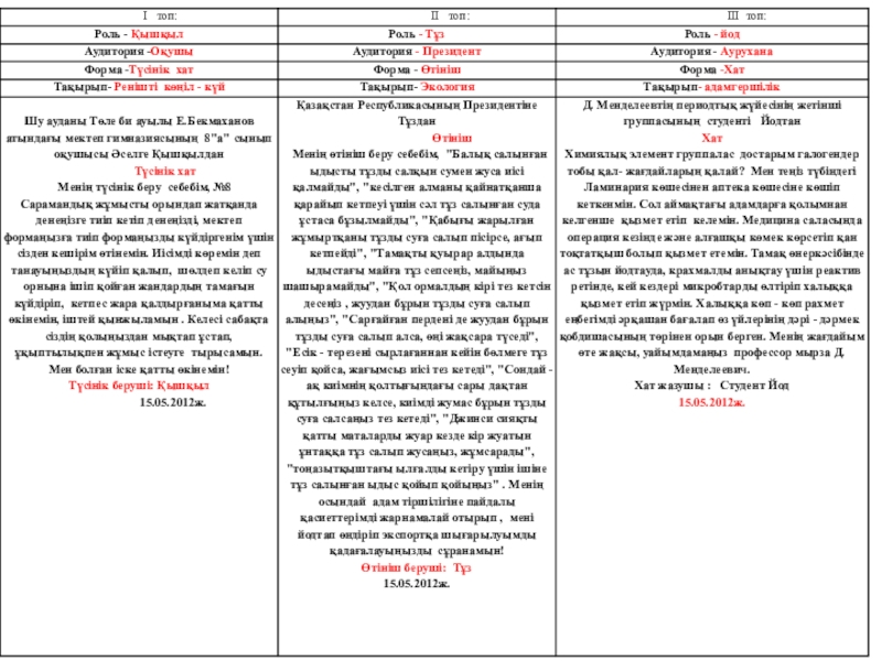 тақырыпта өтініш жазды. Айнұр қышқыл роліне еніп түсінік хат, тұздың пайдалы жақтарын айтып роліне еніп емханаға адамгершілік тақырыпта хат жазды. Әділет йод роліне еніп емханаға адамгершілік тақырыбында хат жазды. Топта өз қалауларымен ой толғаныстарын оқыды: Жансая қышқылдың роліне еніп