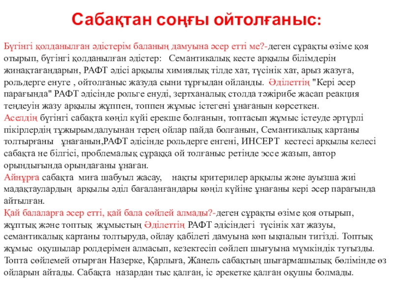Қай балаларға әсер етті, қай бала сөйлей алмады?-деген сұрақты өзіме қоя отырып, жұптық және топтық жұмыстың Әділеттің РАФТ әдісіндегі түсінік хат жазуы, семантикалық картаны толтыруда, ойлау қабілеті дамуына көп ықпалын тигізді. Топтық жұмыс оқушылар ролдерімен алмасып, кезектесіп сөйлеп шығуына мүмкіндік туғызды. Топта сөйлемей отырған Назерке, Қарлыға, Жанель сабақтың шығармашылық бөлімінде өз ойларын айтады. Сабақта назардан тыс қалған, іс әрекетке қалған оқушы болмады.