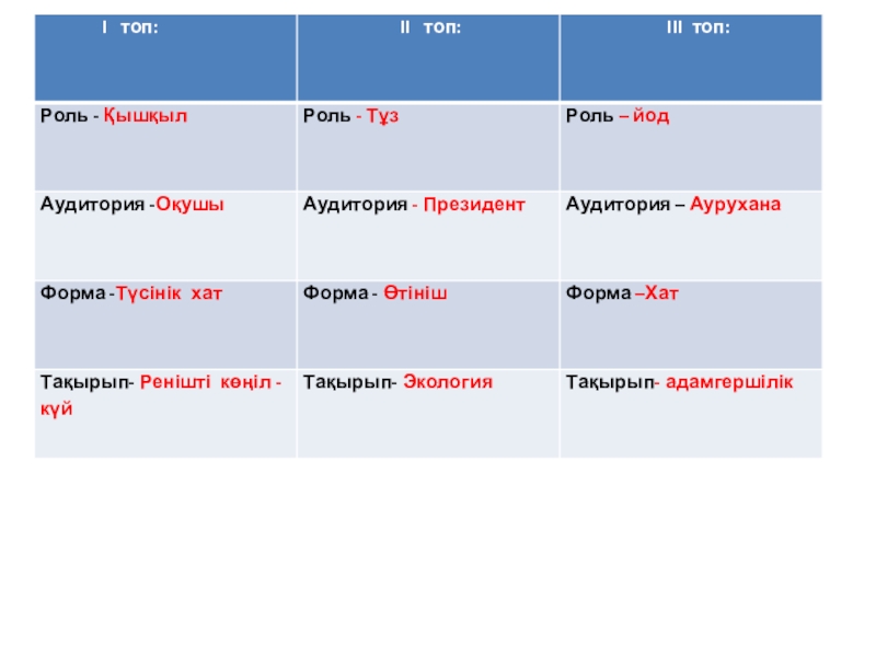топпен талқылап кестені толтырады: